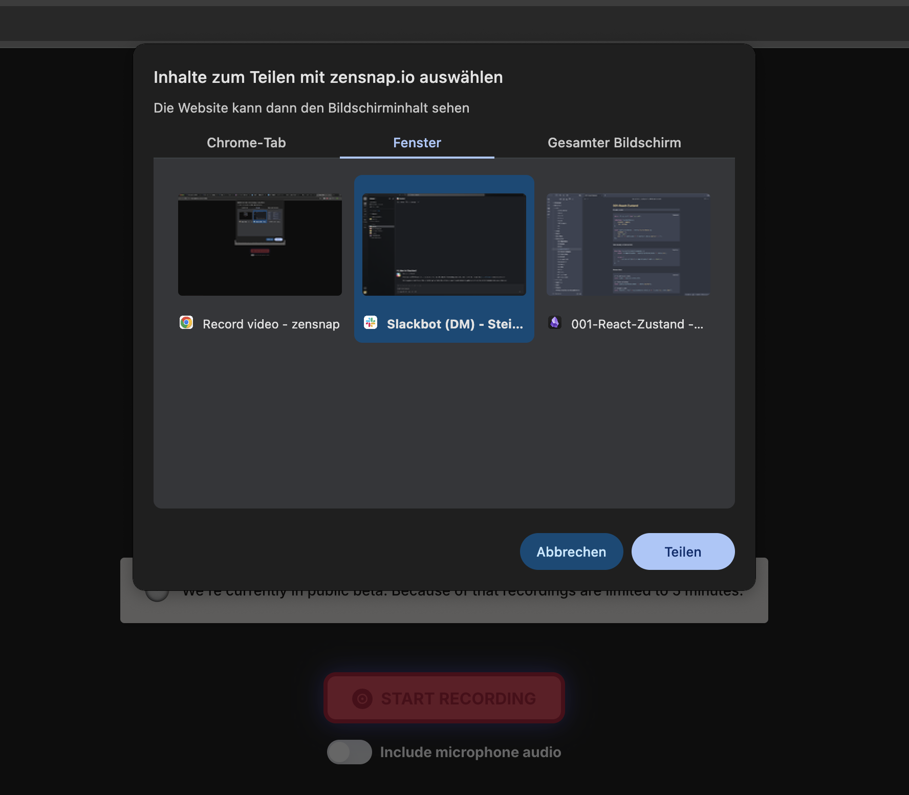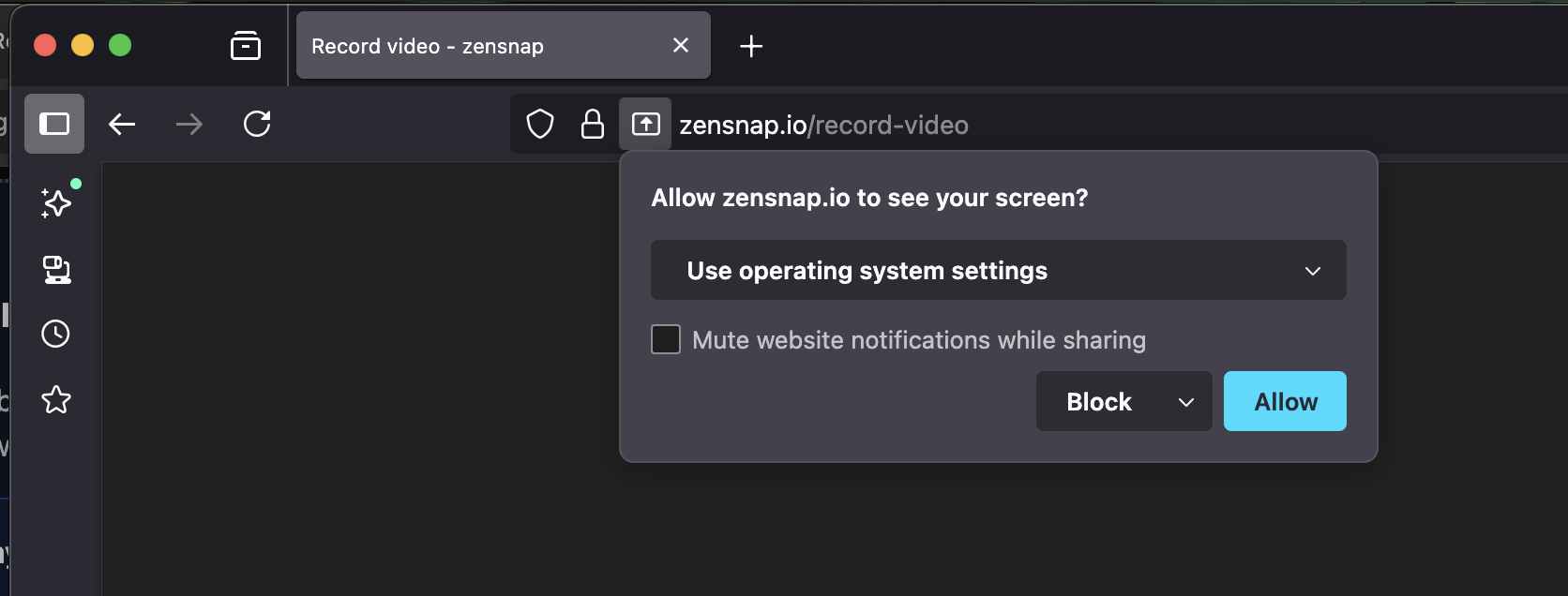 For security and privacy, browsers require your explicit consent before any website can access your screen, microphone, or camera. These permissions are required for zensnap to record.